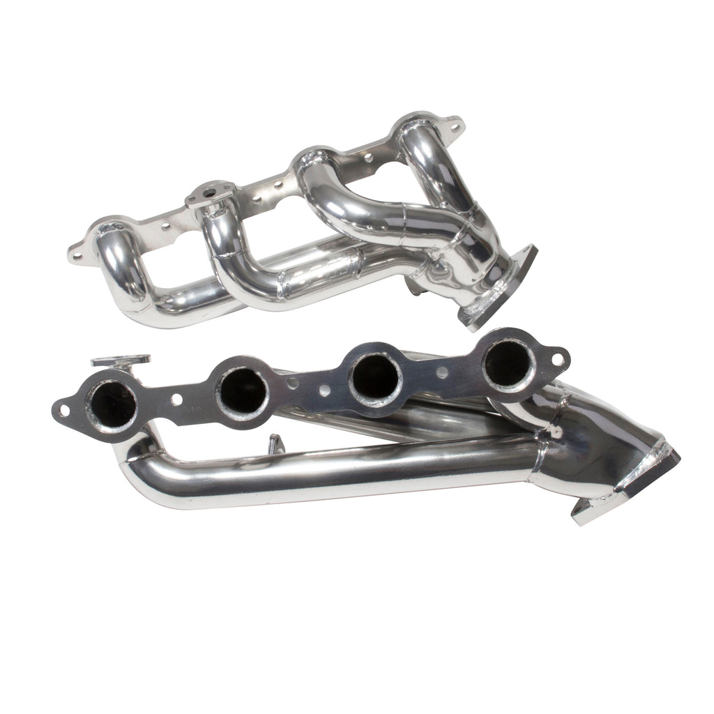 These BBK Performance shorty tuned Length exhaust Headers are designed and constructed as direct fit replacements for all 99-04 GM Truck and SUV 4.8L and 5.3L applications. Each header is manufactured with 1-5/8" CNC mandrel bent tubing that offers unrestricted exhaust flow for increased horsepower and torque over factory OEM manifolds. BBK tuned Length headers offer improved scavenging waves for better combustion, which leads to improved performance and fuel economy over stock or equal Length headers. As with all BBK Performance exhaust headers they feature a 3/8" laser cut flange for additional strength and a guaranteed leak free fit. All headers are robotically and precision hand welded and then pressure tested to ensure years of reliability and performance in the real world. All BBK exhaust headers are available in a Titanium Ceramic or polished silver ceramic coated finish and include new exhaust header gaskets, header bolts and hardware to complete the installation. IMPORTANT NOTE: On The passenger side OE Manifold you must remove the factory OE doughnut gasket and reinstall on the BBK passenger side header so the mid pipe will bolt up and seal