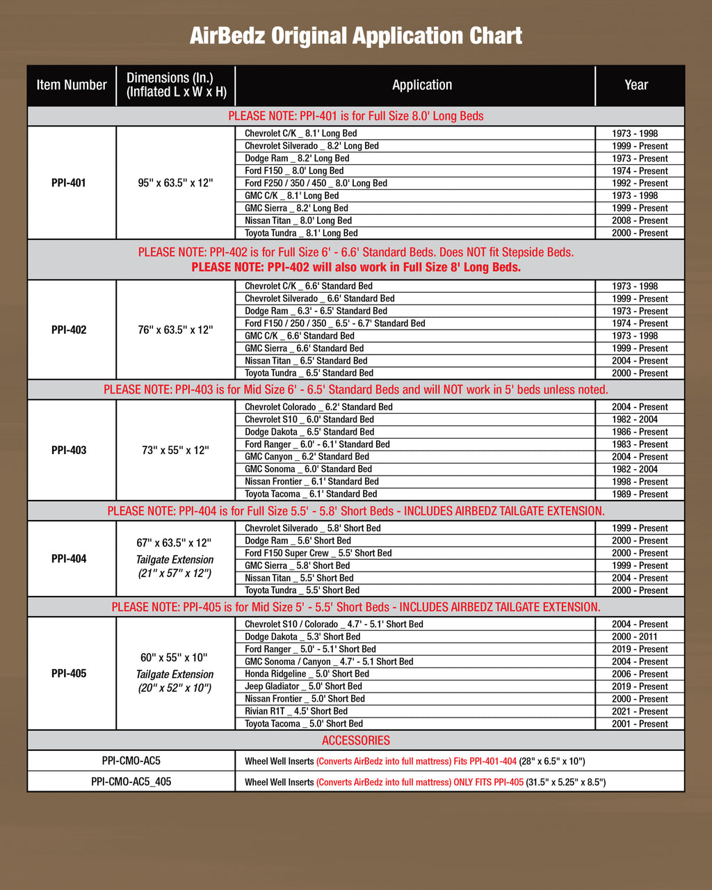 | Description_MKT | Airbedz by Pittman Outdoors Original Truck Bed Air Mattresses are available in multiple sizes and colors to fit mid and full-size trucks in long and short bed layouts. Cutouts on each side allow the mattress to fit around and over the wheel wells, creating a sleeping area that utilizes the entire truck bed, providing more room and comfort for outdoor enthusiasts. A built-in rechargeable pump inflates and deflates the mattress with the flip of a switch. An integrated air coil system evenly distributes weight over a 12-inch-thick mattress. Heavy-duty cloth construction ensures a more puncture resistant mattress that meets the needs of extreme outdoor enthusiasts. Where playing hard and sleeping well are all that matter. Optional inflatable Wheel Well Inserts transform AirBedz into a standard air mattress suitable for home and tent use. (Inserts sold separately) Compatible with: Chevy Silverado 5.8’ bed, Dodge Ram 5.6’ bed, Ford F150 5.5’ bed, GMC Sierra 5.8’ bed, Nissan Titan 5.5’ bed, and Toyota Tundra 5.5 bed. |
