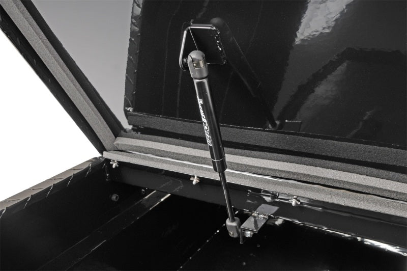 Dee Zee Tool Box - Red Label Double Lid (Gull Wing) Crossover. Constructed of heavy duty Brite-Tread aluminum. Black-Tread powder coat, provides a gloss black finish while it protects and prevents oxidation. Crown style lid for superior rigidity. Other features: lockable stainless steel paddle handles, dampened gas shocks, closed cell foam gasket, and self-adjusting strikers. Removable plastic tool tray to help keep small items organized.