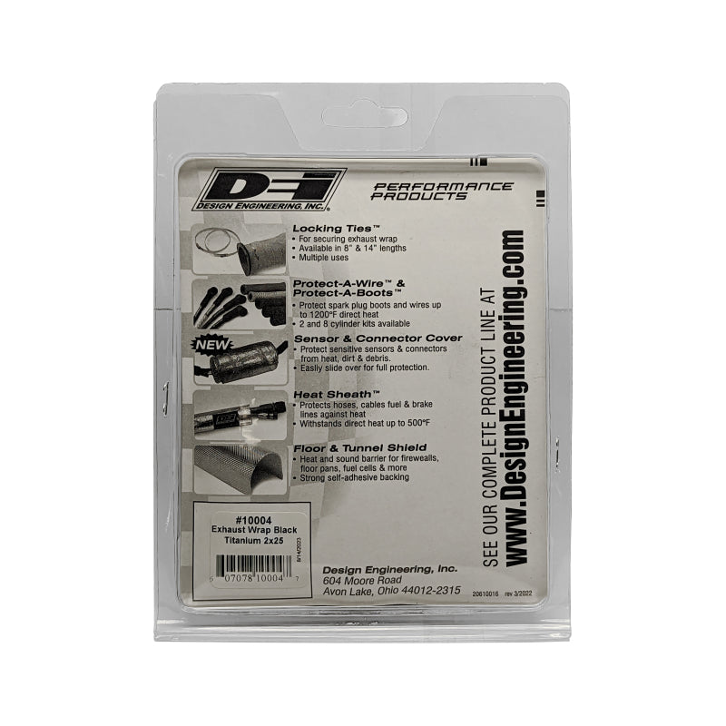 Black Titanium Exhaust Wrap, with LR Technology, is made from pulverized lava rock, stranded into a fiber material then woven into a proprietary weave. Black Titanium wrap is engineered to be stronger than most wraps and more durable for improved thermal performance and reliability. Designed to be pliable and resistant to chemical oil spills and vibration breakdown; it secures tightly without pre-wetting and is able to withstand direct heat up to 1800°F and intermittent heat up to 2500°F. Like the original Titanium Wrap, DEI's Black Titanium Wrap maximizes horsepower and performance by reducing underhood temperatures and maintaining high exhaust gas velocity. Wrapped headers and exhaust also reduces the incidence of heat soak, can prevent harmful burns, protect heat sensitive underhood components, and reduce the level of heat transmitted through the firewall and floor of the vehicle for a more comfortable interior. Black carbon fiber look Extremely pliable for a tight & secure wrap Withstands 1800?F direct / 2500?F intermittent heat Pre-wetting roll not necessary for wrapping Reduce underhood temps NOTE: Catalytic Convertors: Wrapping of the catalytic converter is not recommended, as overheating can lead to reduced lifetime of the converter. Instead, try our Corvette Catalytic Converter Shield or create your own shield using our Floor & Tunnel Shield II(TM). Removal: Exhaust wrap is not designed to be moved or removed after it has been heat cycled. After the fibers have been heated, they lose their initial flexibility. This does not reduce the thermal properties of the exhaust wrap. Be aware of this before you decide to remove the wrap. For this reason, you should avoid wrapping any flex-pipes or flex-joints.