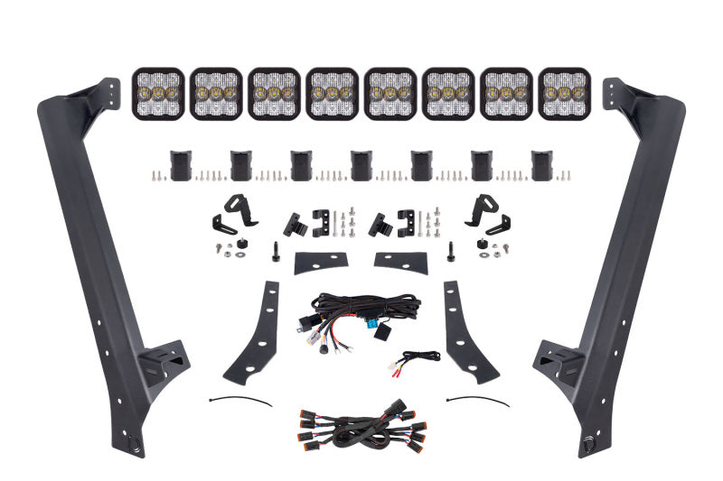 FeaturesBolt-on fitment compatible with Jeep JK Wrangler 2007-2018Ultra-high intensity with custom-engineered TIR opticsSelectable backlight color with eight color optionsTorture-tested heavy-duty constructionControl through factory aux switch bank using the included harnessAssembled in USAOverviewPerfect Fitment. The Windshield CrossLink Lightbar Kit compatible with Jeep JK Wrangler 2007-2018 from Diode Dynamics allows you to mount eight linked SS5 LED pods above the factory windshield. These application-specific brackets were CAD-designed to bolt into place using factory mounting points above the factory windshield. No cutting or drilling required!Designed for Performance. Featuring the highest output intensity of any 5-inch LED pod on the market these lamps have been designed for maximum functionality with patented technology and custom-engineered TIR optics all in a durable package.Selectable Backlight. The SS5 LED Pods included in the White kit feature a selectable backlight with eight different color options perfect for extra styling or for more visibility when you(TM) re not using the main beam. Selecting your backlight color is easy - simply alternate the power on and off. There(TM) s no complicated programming with a controller! The SS5's backlight fully illuminates the TIR optic providing unique accent lighting that you won't find on other LED pods. NOTE: Due to the yellow lens the Yellow kit is only available with an Amber backlight.CrossLink. Our patent-pending CrossLink technology allows you to link up to eight SS5 pods together to create your own lightbar. The single-piece CNC aluminum link provides extreme rigidity but is fully adjustable for both straight and curved configurations.