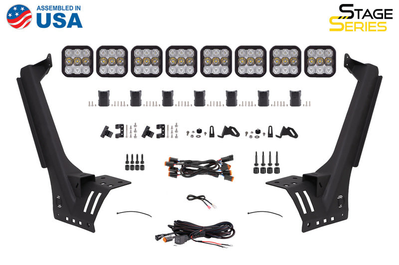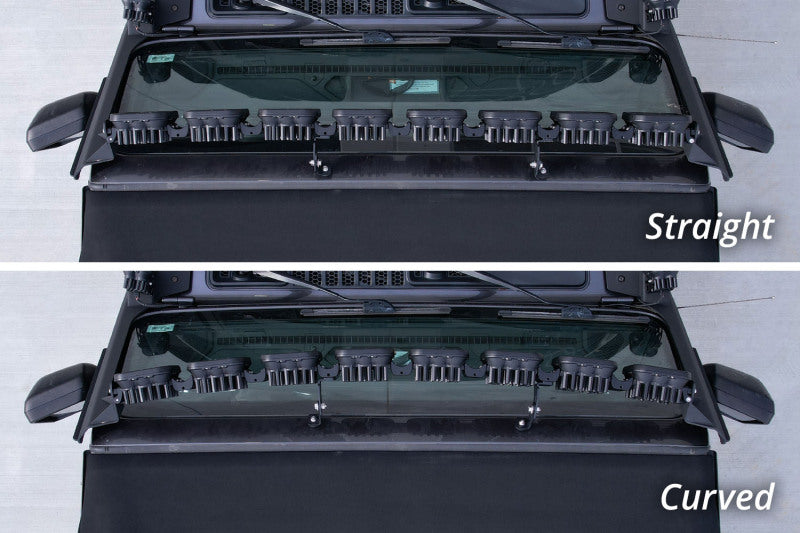 FeaturesBolt-on fitment compatible with Jeep JL Wrangler 2018-2021Ultra-high intensity with custom-engineered TIR opticsSelectable backlight color with eight color optionsTorture-tested heavy-duty constructionControl through factory aux switch bank using the included harnessAssembled in USAOverviewPerfect Fitment. The Windshield CrossLink Lightbar Kit compatible with Jeep JL Wrangler 2018-2021 from Diode Dynamics allows you to mount eight linked SS5 LED pods above the factory windshield. These application-specific brackets were CAD-designed to bolt into place using factory mounting points above the factory windshield. No cutting or drilling required!Designed for Performance. Featuring the highest output intensity of any 5-inch LED pod on the market these lamps have been designed for maximum functionality with patented technology and custom-engineered TIR optics all in a durable package.Selectable Backlight. The SS5 LED Pods included in the White kit feature a selectable backlight with eight different color options perfect for extra styling or for more visibility when you(TM) re not using the main beam. Selecting your backlight color is easy - simply alternate the power on and off. There(TM) s no complicated programming with a controller! The SS5's backlight fully illuminates the TIR optic providing unique accent lighting that you won't find on other LED pods. NOTE: Due to the yellow lens the Yellow kit is only available with an Amber backlight.CrossLink. Our patent-pending CrossLink technology allows you to link up to eight SS5 pods together to create your own lightbar. The single-piece CNC aluminum link provides extreme rigidity but is fully adjustable for both straight and curved configurations.