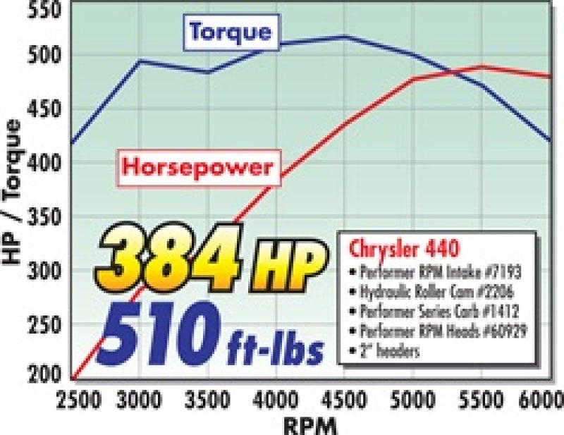 Edelbrock Rollin' Thunder Camshaft #2206 is designed for 383-400-440 Chrysler V8 engines and produces optimum torque from the low-end to the mid-range. Rollin' Thunder camshafts should be matched with Performer manifolds for vehicles operating from off-idle to 5500 rpm. They are smooth idling cams for daily drivers, trucks, vans, RVs and 4x4s. You can expect a major improvement in throttle response and torque. In the manifold section you'll find torque graphs showing the power gains from Performer manifolds and Performer-Plus cams. All camshafts include flat tappet lifters (except for cams designed for use with stock roller lifters), assembly lube and instructions. This cam produced 571HP and 523 Ft Lbs of Torque when paired with Pro-Flo XT EFI system #3544,Performer RPM cylinder heads #60925 and Edelbrock roller tappet lifter set #97483. Must use included bronze distributor gear, failure to do so could result in engine failure. Camshaft utilizes three bolt configuration. Must use with high stall torque converter only. Camshaft specifications: - Intake duration: 240 Degrees - Exhaust duration: 248 Degrees - Intake lift: .540" - Exhaust lift: .545" - Lobe separation: 112 Degree - Intake Center Line: 107 Degree - Vacuum: 10"