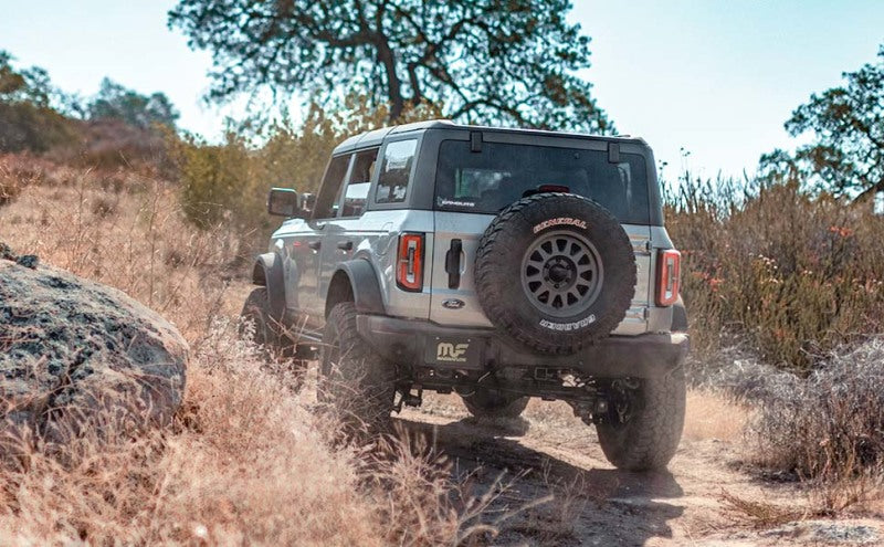The MagnaFlow Ford Bronco Overland Series Cat-Back Performance Exhaust system #19559 is the perfect solution to further improve the off-road utility of your already-capable 2021-2023 Ford Bronco equipped with the 2.7L twin-turbo V6. This cat-back, direct-fit exhaust kit is designed to install easily and fit perfectly thanks to the hard work of the engineers at MagnaFlow’s Tech Center, who made detailed 3D scans of the entire vehicle in order to ensure perfect fitment. The advantage of such precise tolerances is that the entire performance exhaust system is mounted closer to the undercarriage of the vehicle than the stock system, resulting in significantly improved ground clearance. #19559 also features 3” main piping that leads to a straight-through muffler before terminating in a single 2.5” high-clearance side exit, which further improves the rear departure angle versus the standard tailpipe. The result of this upgrade is improved rock crawling capability and the ability to get out of tricky situations on the trail more easily. This Ford Bronco exhaust system utilizes a tunable NDT (No Drone Technology) quarter-wave resonator to eliminate unwanted noises at cruising speeds en route to your destination, with the added benefit of improving situational awareness when you’re out exploring or camping in the middle of nowhere. Exhaust kit #19559 is engineered to produce MagnaFlow’s deep signature exhaust tone at mild interior and moderate exterior sound levels, ideal for enjoying the character of your engine without scaring Mother Nature away. The exhaust system is built to last thanks to the use of precision CNC robotic manufacturing techniques and durable stainless-steel construction, all backed by MagnaFlow’s limited lifetime warranty.