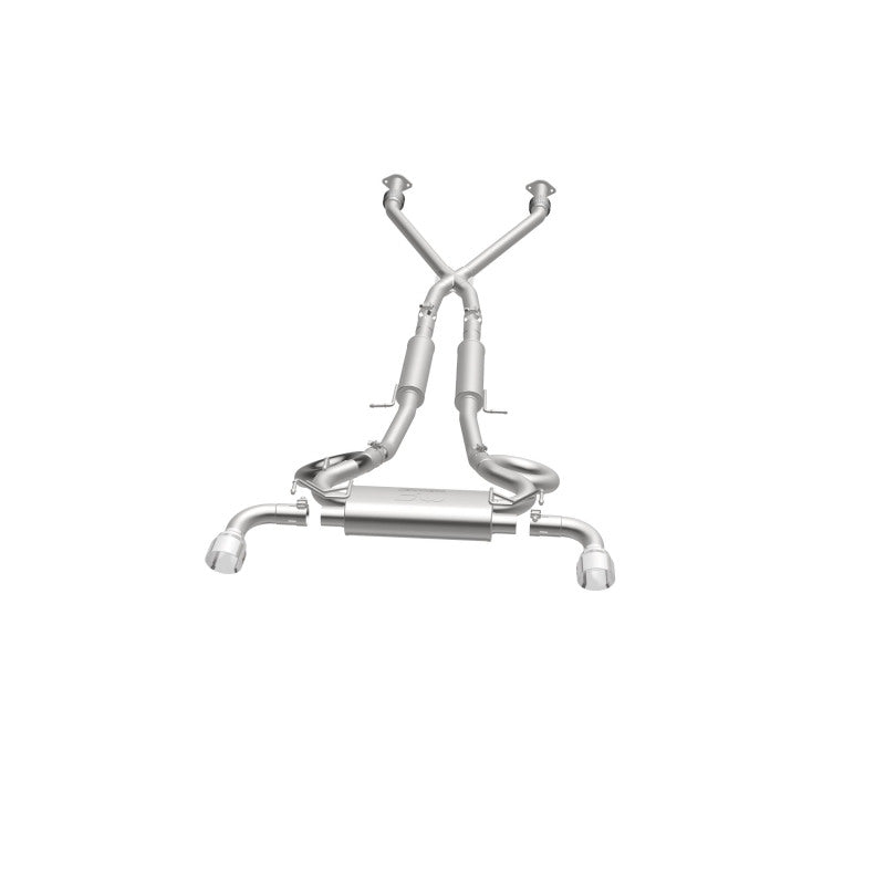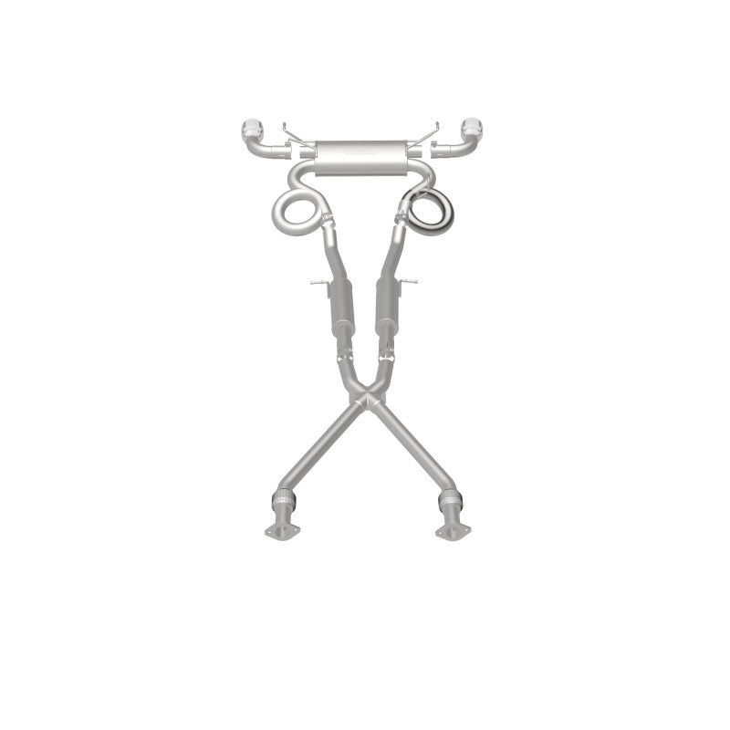 The MagnaFlow 2009-2020 Nissan 370Z Street Series Cat-Back Performance Exhaust System 19135 brings out the personality of your 3.7L 2009-2020 Nissan 370Z with our signature resonant, powerful engine tone and dyno-proven performance. Thanks to its fast-flowing, mandrel bent 2.5in. main piping and 3 Straight-Through mufflers ending in a Dual Split Rear exit with 4.5in. Polished Welded-On Double Wall Angle Cut Folded Edge tips, this Nissan 370Z exhaust kit has the performance chops to match its sporty sound and appearance. Upgrade your ride to the next level with an exhaust that has the pipes to put other Nissan 370Z's to shame. With this system your vehicle will be producing Moderate exterior and Mild interior sound levels while leaving other cars and trucks feeling envious at every stoplight. Exhaust kit 19135 features a cat-back layout that replaces your ride's stock exhaust components from near the catalytic converter on back. Extensive 3D scanning during development has resulted in a direct-fit design that you can easily install yourself. 19135 is produced using CNC precision robotic manufacturing techniques and is backed by MagnaFlow's 1-year limited finish warranty and limited lifetime construction warranty.