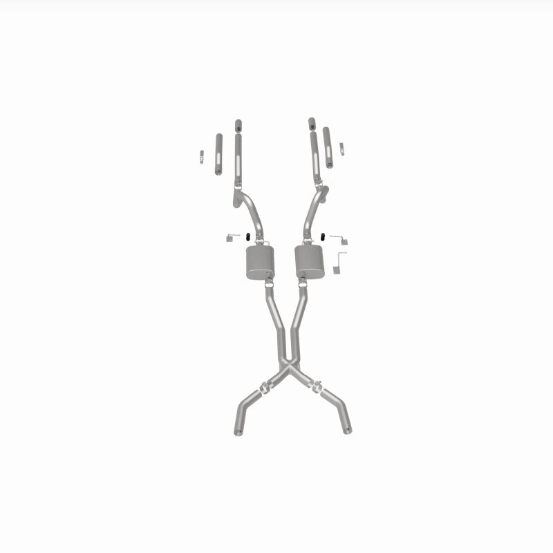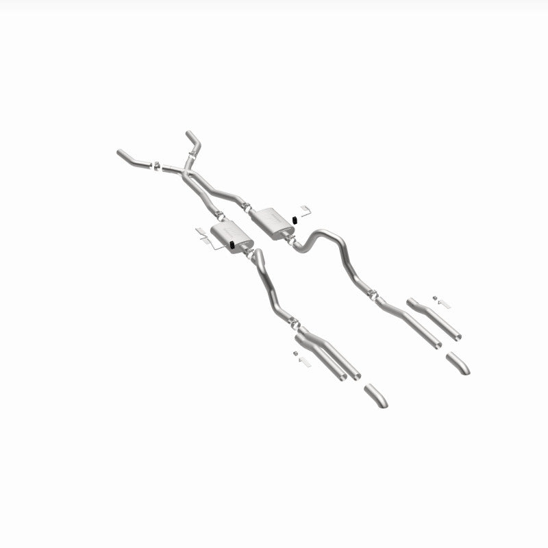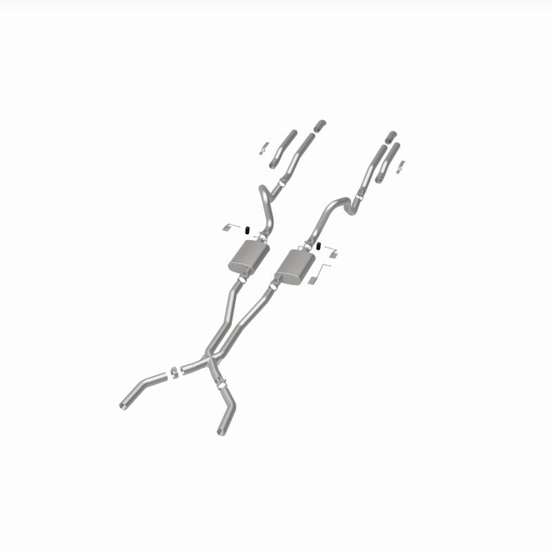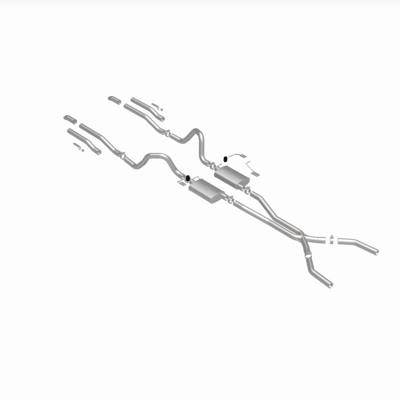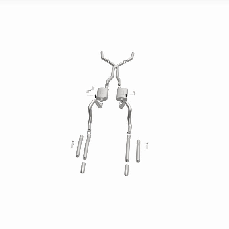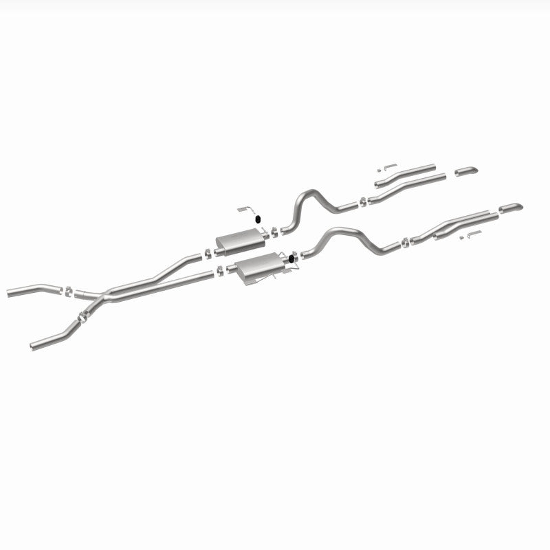 The MagnaFlow Street Series Crossmember-Back Performance Exhaust System 19303 19303 brings enhanced engine sound and dyno-proven performance to your muscle car with a healthy helping of our deep, resonant signature exhaust note at Moderate exterior and Mild interior sound levels. Thanks to its durable, corrosion resistant stainless steel design, this exhaust system will handle whatever tarmac you decide to leave your mark on. This performance exhaust kit features a crossmember-back layout designed to replace your exhaust system from the crossmember on back. With its fast-flowing, mandrel bent 2.5in. main piping and 2 Straight-Through mufflers ending in a Dual Split Rear exit with 2.625in. Polished Weld-On Single Wall Turndown Cut Edge tips, your muscle car will be sounding as awesome as it looks. Extensive 3D scanning during development has resulted in a direct-fit design that you can easily install yourself. 19303 is produced using CNC precision robotic manufacturing techniques and is backed by MagnaFlow's limited lifetime construction warranty.