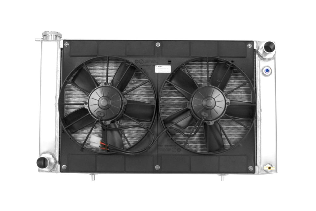 Radiator and Fan - 29.25 in W x 18.375 in H x 7.188 in D - Dual Fans - Passenger Side Inlet - Driver Side Outlet - Transmission Oil Cooler - Aluminum - Natural - Ford Coyote - Ford Mustang 1967-70 - Kit
