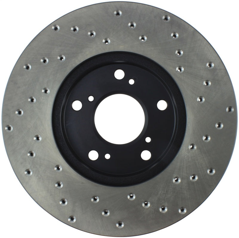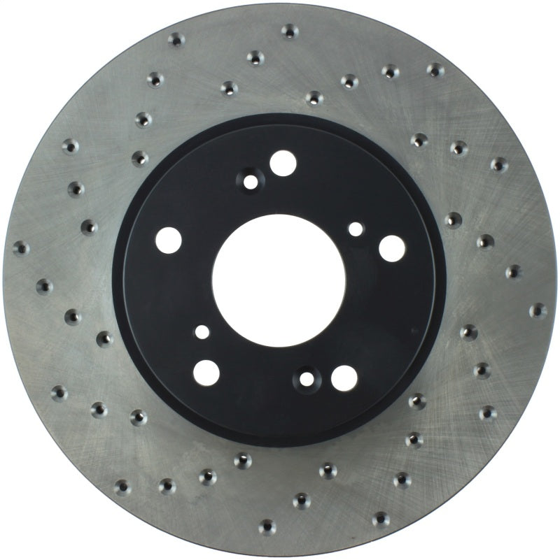 StopTech Drilled Sport Rotors are 1-piece direct replacement brake discs for factory brake systems and stock calipers that look great behind your wheels – and offer significantly improved braking performance. The unique cross-drilling aids with heat and brake dust dispersal, prevents glazing of the pads, adds bite and improves wet and dry braking performance. Built to last, the black e-coating provides protection from corrosion and the high carbon metallurgy (in most applications) offers quieter operation, better crack resistance and increased performance.
