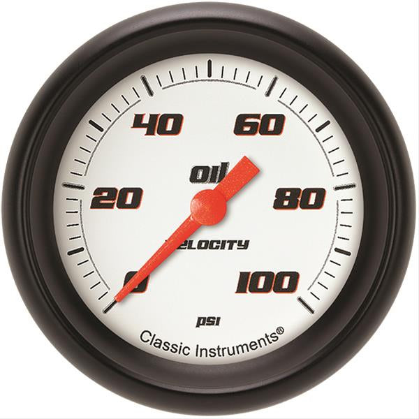 Oil Pressure Gauge - Velocity - 0-100 psi - Electric - Analog - Full Sweep - 2-5/8 in Diameter - Black Bezel - Flat Lens - White Face - Each