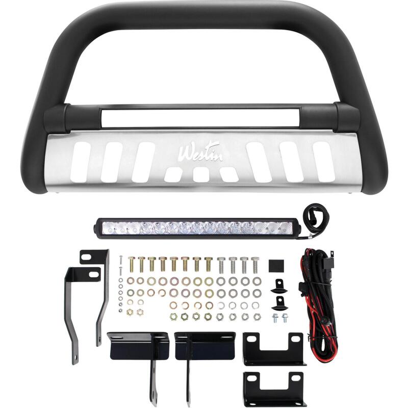 Westins Ultimate LED Bull Bar will take your truck to the next level with this cool new look! The integrated light bar is a 20 single row with 15 x 3 Watt Osram LEDs. The LED light bar is flush mounted in the center cross tube and weather sealed for moisture resistance. Built with 3 steel tubes, our Ultimate LED Bull Bar features molded transition bushings and a brushed stainless steel skid plate for a perfect look. The product is available in chrome plated stainless steel backed by a lifetime warranty, and in textured black powder coat backed by a 3-year warranty. Make a bold statement with Westins new Ultimate LED Bull Bar and give your truck the durability, look and style it deserves.
