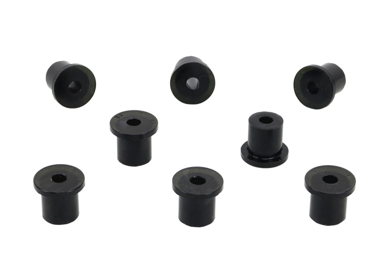 A critical service item for any leaf sprung vehicle. High kilometres and heavy load carrying causes excessive wear on rubber bushings. Whiteline's signature black bushings are made tough and offer outstanding abrasion resistance, high load bearing capability (4WD's, utes and towing), flexibility, increased tensile strength and chemical resistance to oil, grease, ozone and weathering.