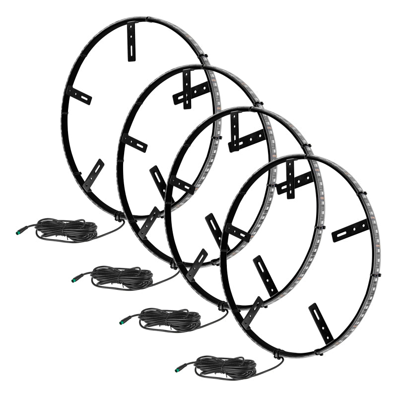 Los aros de rueda con iluminación LED de ORACLE Lighting son una manera fácil y eficaz de iluminar las ruedas de su automóvil o camión. Este llamativo producto de iluminación consta de un conjunto de (4) aros de aluminio con iluminación LED que se instalan alrededor del rotor del freno y se adhieren al protector contra el polvo del freno. También se pueden montar en vehículos más antiguos con frenos de tambor. El efecto es un gran anillo de luz que acentúa las ruedas personalizadas y se destaca en los eventos. El diámetro de 16,5" de gran tamaño es el más grande del mercado y se adapta a frenos de gran tamaño. Este kit ahora cuenta con un blanco VERDADERO de 6000 K de LED blancos separados para una salida BLANCA VERDADERA para una luz blanca nítida y limpia. ¡Cambia colores, controla el brillo, accede a patrones de luz estroboscópica y sincroniza con la música! Ahora cuenta con control dual que permite al usuario usar tanto el control de la aplicación gratuita para teléfonos inteligentes Bluetooth como el control remoto inalámbrico incluido. La instalación es fácil con conectores Plug & Play a prueba de agua que conectan fácilmente los anillos individuales a la caja de control central. Los cables de conexión de la batería incluyen terminales de anillo y fusible en línea para una instalación de cableado simplificada. También hay un interruptor de encendido/apagado precableado que se puede usar para encender y apagar manualmente el sistema para un control máximo. Las actualizaciones adicionales de nuestras luces LED para ruedas incluyen anillos de aluminio más gruesos, acabado anticorrosivo con pintura en polvo negra, conectores a prueba de agua y soportes preinstalados. Consejo de instalación: para mayor seguridad de los tornillos que sujetan los soportes en los anillos de las ruedas, primero confirme que los soportes de los anillos de las ruedas estén en la ubicación de montaje correcta. A continuación, aplique una cantidad adecuada de Loctite a estos tornillos para garantizar una sujeción firme. Si su vehículo está equipado con frenos de tambor o no tiene un protector contra el polvo de los frenos, deberá realizar una fabricación adicional de soportes para que se ajusten correctamente. Tenga en cuenta que estos anillos no están diseñados para usarse mientras conduce.