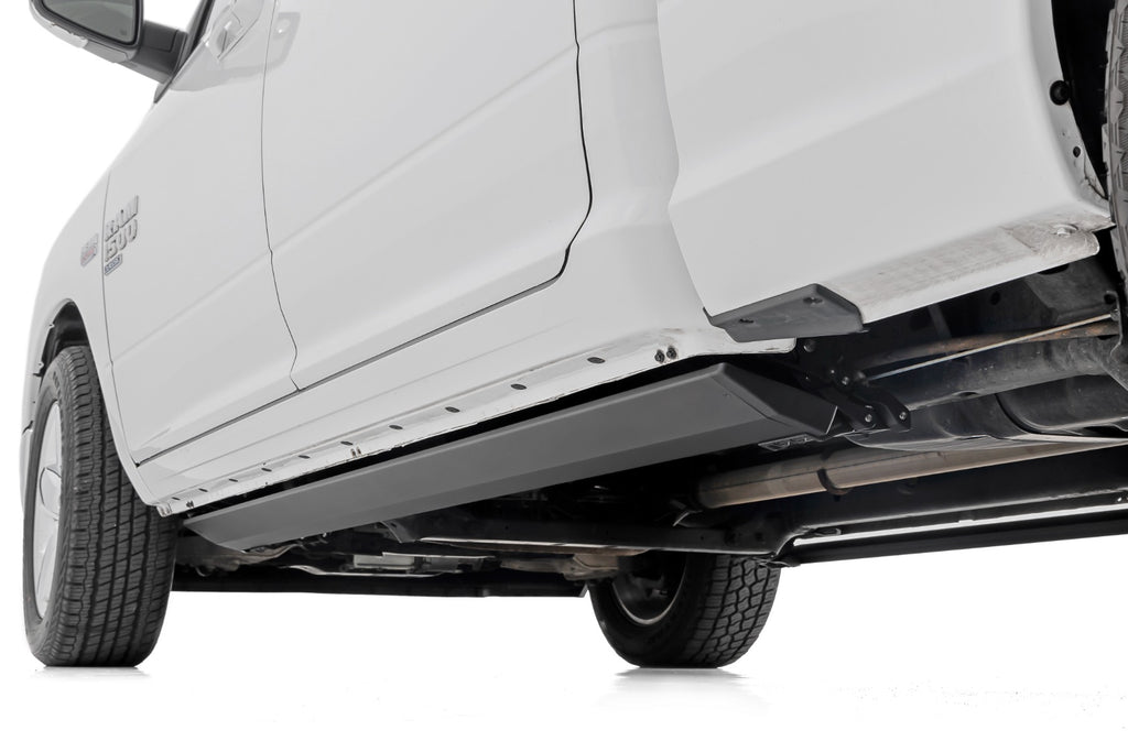 Step up in style. Sidesteps have come a long way, and now we've taken them to the next level with Rough Country's Power Running Boards! These retractable E-Boards tuck tight for a clean look when not in use and automatically extend when the door is opened. With an anti-slip surface that provides a secure stepping area, getting in and out of your ride has never been easier. Our Power Running Boards also include LED lights that provide illumination when deployed and shut off when steps are closed, providing a sleek, aerodynamic look.\ Premium Construction. The Rough Country E-Board Steps combine durability, strength, and style. These 6" all-season steps are made from lightweight yet durable aluminum and can support up to 660 lbs per side. Equipped with dual motor technology, these steps can handle anything Mother Nature throws their way. They feature an automatic 'SAFE-STOP' mechanism that engages if a blockage is detected and include an interior bypass switch for manual override. So whether you're heading out on a weekend errand or loading up for a camping trip, our electric steps offer reliable protection for all your adventures.\Installation. These easy-to-install steps are the perfect solution for getting in and out of your vehicle. Minor drilling is required for installation, and the steps tuck tight under the rocker panel when not in use. Don't struggle to get in and out of your vehicle anymore. Make life easier with Rough Country's Power Running Boards.\Warranty. Rough Country backs its products with a limited lifetime replacement warranty. Our products are protected from structural and workmanship damage after purchase. Our industry-leading warranty gives you peace of mind when using Rough Country products!
