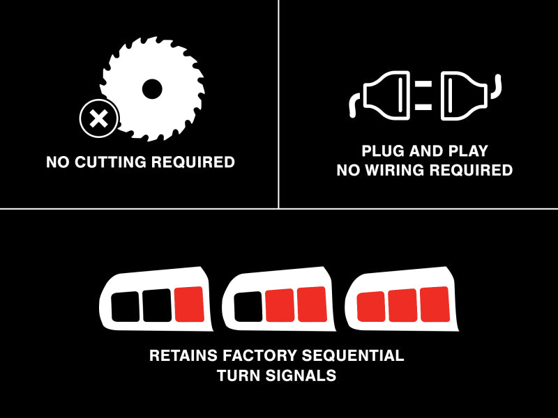A pair of Raxiom Profile Smoked LED Tail Lights are a great way to add sleek, clean styling to the exterior of your S550 Mustang. Featuring black housings with smoked lenses, these Raxiom LED Tail Lights will make an impactful statement to the appearance of your S550 Mustang. Whether your Pony is your daily driver or a full blown track beast, these LED Tail Lights will be sure to set your Mustang apart from all the rest. These Raxiom Profile Tail Lights were designed to retain the very popular sequential function that not only looks awesome, but also supplies an added bit of safety when out cruising. When the turn signals are activated, they will sequence from the center light out and repeat until switched off. Please note that these lights do not sequence with the brake or hazard lights. Manufactured to precise standards from OEM quality materials, these Raxiom Profile Tail Lights are assembled with super bright red LEDs for use as turn signals and brake lights. These Tail Lights feature durable gloss black plastic housings with smoked polycarbonate lenses. Each Tail Light is weather-sealed to prevent dirt and moisture from harming the state of the art electronics found inside. Using basic hand tools, installation of these Tail Lights should take no longer than 30 minutes to complete. Raxiom designed their LED Tail Lights to be a direct plug and play replacement for your Mustang's original factory housings. There is no cutting or modifications required for a clean straight forward install. Please note that these Lights reuses the original factory top trim plates. These Raxiom Profile Smoked LED Tail Lights will not only bring a fresh new look to your Mustang, but they also meet or exceed the strict guidelines set forth by the U.S. Department of Transportation (DOT) and the Society of Automotive Engineers (SAE), making them legal for street use. It will not function properly on Mustangs sold in the EU or UK without modifications being made to the wiring harness.