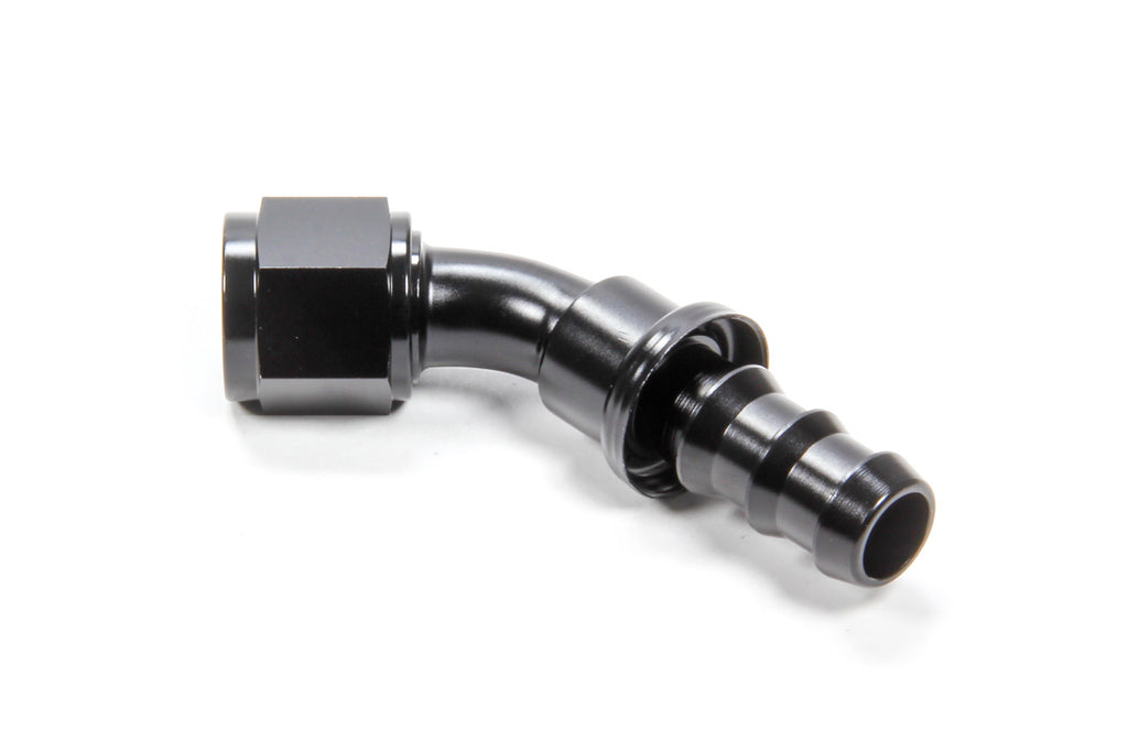 Fitting - Hose End - 45 Degree - 10 AN Hose Barb to 10 AN Female - Aluminum - Black Anodized - Each