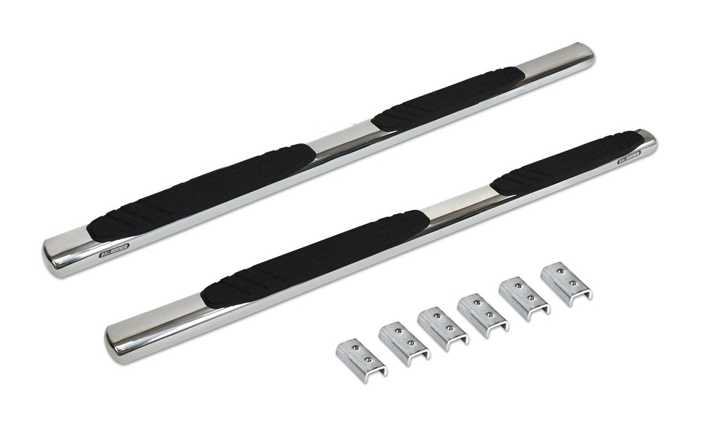 4" WIDESIDER Platinum Kit: Bars + Brackets - Channel mount. 87" Long. Polished stainless steel. Features welded in, polished stainless steel endcaps. Channel mount design fits with all WIDESIDER bracket kits. Available for regular, extend and crew cab pick up trucks, also for SUV's and CUV's. Bolt-on, no-drill installation for most applications. Features SuperGrippy step pads for sure footing. Bar lengths available for most trucks. Limited lifetime warranty.