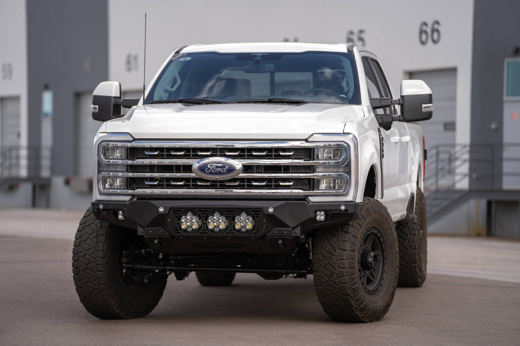| Description_EXT | 2023-Up Ford Super Duty F250 - Bomber Front Bumper 3 Baja Designs LP6 Mounts And Dually Mounts On Sides In Hammer Black With Satin Black Panels |