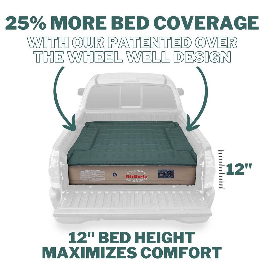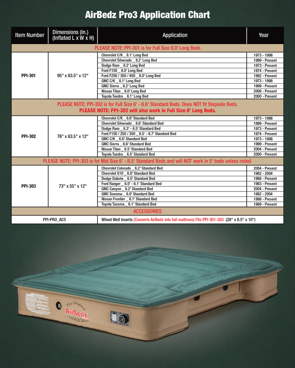 | Description_MKT | Airbedz Pro3 by Pittman Outdoors Original Truck Bed Air Mattresses are available in multiple sizes to fit mid and full-size trucks in long and short bed layouts. Cutouts on each side allow the mattress to fit around and over the wheel wells, creating a sleeping area that utilizes the entire truck bed, providing more room and comfort for outdoor enthusiasts. A built-in DC Air pump with 19 ft. cord inflates and deflates the mattress with the flip of a switch. An integrated air coil system evenly distributes weight over a 12-inch-thick mattress. Durable Fabric construction ensures a more puncture resistant mattress that meets the needs of extreme outdoor enthusiasts. Where playing hard and sleeping well are all that matter. Optional inflatable Wheel Well Inserts transform AirBedz into a standard air mattress suitable for home and tent use. (Inserts sold separately) Compatible with: Chevy Colorado 6.2’ bed, Chevy S10 6.0’ bed, Dodge Dakota 6.5’ bed, Ford Ranger 6.0’-6.1’ bed, GMC Canyon 6.2’ bed, GMC Sonoma 6.0’ bed, Nissan Frontier 6.1’ bed, Toyota Tacoma 6.1’ bed |