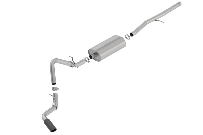 Factory Single Side Exit vehicles ONLY. Add Adapter 60708 for Crew Cab with Standard Bed (6' 7") 157" Wheelbase vehicles. The 140793BC Cat-Back(tm) system by BORLA(r) is a side exit system featuring the mellow Touring sound level and a 4" black chrome on T-304 stainless steel tip. A bright chrome on T-304 stainless steel tip is also available. Using BORLA(r) Stainless Steel Polish p# 21461 is NOT recommended with these black chrome tips. We suggest cleaning the tips with hot water and a microfiber cloth. Add Adapter 60706 For Crew Cab with Standard Bed (6' 7") 157" Wheelbase vehicles. BORLA(r) Cat-Back(tm) and Axle-Back exhaust systems feature patented straight-through and multi-core technology designed to unleash hidden horsepower. Increased exhaust velocity adds power, driving excitement, fuel economy, and the distinctive BORLA(r) Sound of Power respected by motoring enthusiasts everywhere. Each system is built from premium, high-quality T-304 austenitic stainless steel, superior to T-400 to give you the absolute best in performance and durability. Ultra-smooth mandrel bends ensure maximum flow & power, and precision CNC manufacturing ensures an accurate fit. You can count on BORLA(r) to provide durability, performance, sound, and a Million-Mile Warranty. See separate note about warranty on tip finish.