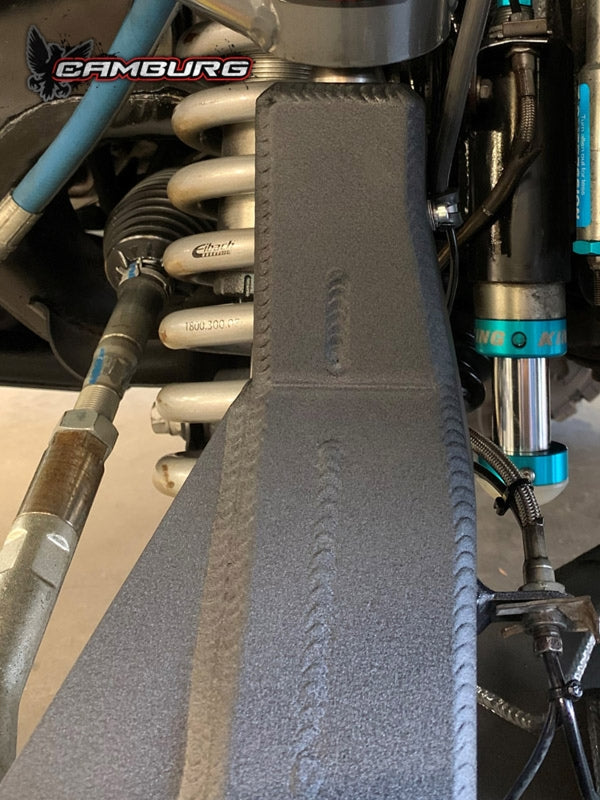 Introducing our Camburg performance spindles, the strongest stock replacement spindles/knuckles on the market. Designed to work with our long-travel kit and stock length lower arms, these spindles offer enhanced strength and craftsmanship. We have leveraged our 13+ years of experience with the stock design and custom versions for the military to create a superior product. Our spindles feature improved geometry and increased durability, along with a relocated ABS speed sensor for off-road protection. Compatible with both 4WD and RWD models, these spindles require no modifications and maintain the factory specifications in terms of lift and width. Using advanced Faro scanning technology and SolidWorks CAD/CAM modeling, we manufacture these spindles in-house for precise control. Starting with steel billets, we heavily CNC machine them for weight reduction and precision, followed by MIG welding of laser-cut plates. The spindles are then sandblasted and powder coated textured black for a durable finish. They come ready to install with all necessary hardware, including stronger stainless braided Kevlar reinforced front brake lines. For 2016+ models, drilling out the brake caliper bolt holes to 9/16" is required due to larger metric bolts. We recommend replacing the inner hub seal on older or higher mileage 4WD vehicles. Please note that these spindles are designed as OEM replacements and are not compatible with drop-down bracket lift kits.