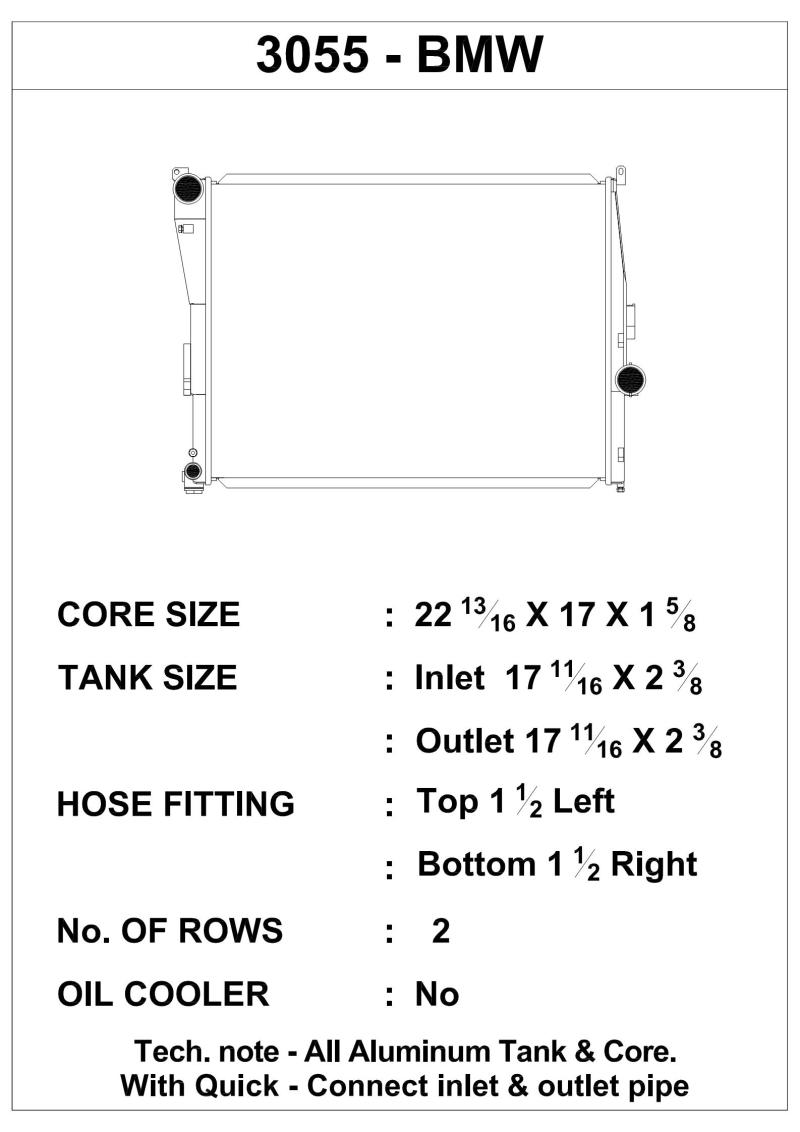 CSF has over 5 decades of experience manufacturing radiators. So when it comes to keeping your engine cool and your E46 3-Series/Z4 running at its best, a CSF High-Performance All-Aluminum Radiator is the obvious choice. Designed to perform on the street or at the track, a performance radiator is a must-have for both high horsepower builds as well as race vehicles which need added cooling performance in motorsports environments. This radiator features a 2-Row core with CSF's exclusive B-Tube Technology: Unlike a regular oval shape "O" type radiator tube, CSF uses a specially engineered tube in the shape of a "B". These "B-tubes" are carefully formed and then brazed over the seam to seal. CSF is able to use thinner and lighter aluminum material (with better cooling efficiency) because this design is actually stronger than normal "O" shape tubes that are welded. The design (inlet in the middle of the tube that is seam brazed) increases the heat transfer surface area of the tubes by approximately 15% over regular tubes - producing the efficiency of two smaller tubes vs. one large tube within the same space criteria. With "B-tubes" you are able to get "dual liquid laminar flow". CSF also uses ultra efficient multi louvered fins that are carefully and precisely aligned to maximize airflow through each radiator core. Fin specifications are carefully measured and calculated for each application, and tested for maximum heat rejection efficiency in our wind-tunnel lab.The CSF E46 3-Series/Z4 radiator is a true "Drop-in fit" design requiring no modifications to install. OE style brackets are all CNC machined and welded for the best durability possible. Inlet/Outlet connections are designed to match the OE connections so you can reuse OEM hoses or aftermarket. Trust the cooling experts at CSF for the best performing, highest-quality, and most reliable radiators.