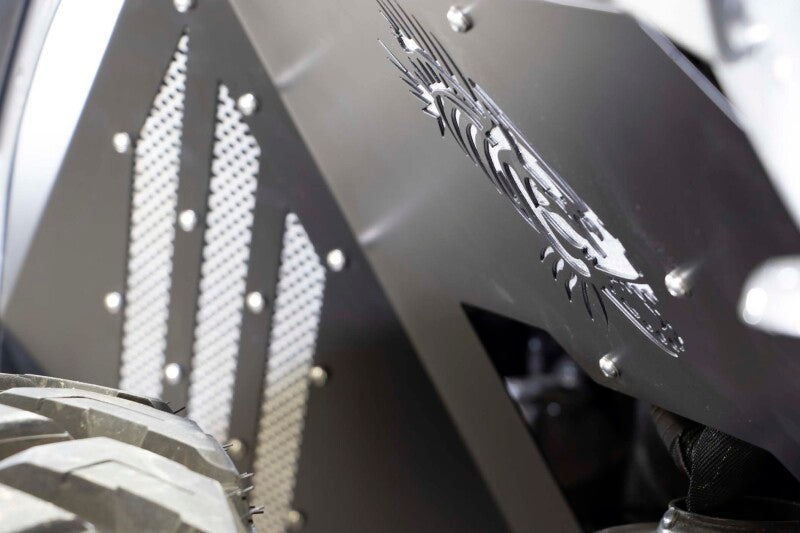 Fits 2018 to Current JL Wrangler, Rubicon and Unlimited 2 and 4-Door Models. Made from Black Powder Coated Aluminum. Fishbone logo laser cut on all 4 inners. Front Inner Fender JL Rear set will only fit JL Wrangler.
