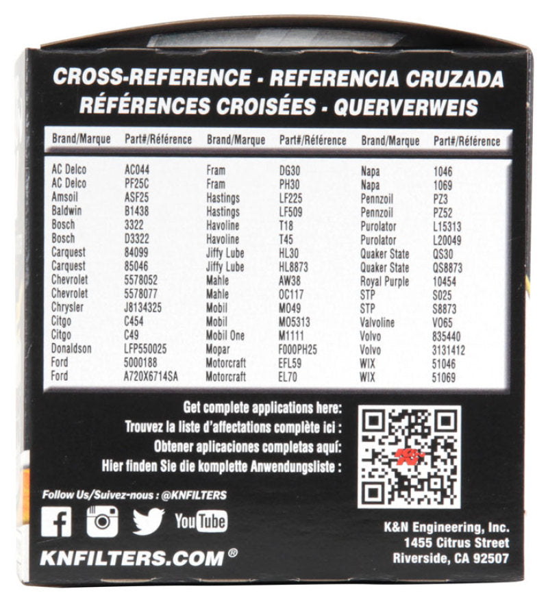 K&N premium oil filters are meticulously engineered to offer outstanding filtration and engine protection. Designed to operate with all synthetic, conventional, and blended motor oils, K&N's pleated synthetic-blend filtration media helps to shield your engine from contaminants and ensure a consistent flow of oil. The heavy-duty canister is engineered to be exceptionally durable, and a one-inch welded hex nut can be used for quick and easy filter removal. Each filter is specifically designed to withstand the service intervals recommended by vehicle manufacturers, and is protected by the K&N 1-Year Limited Warranty.