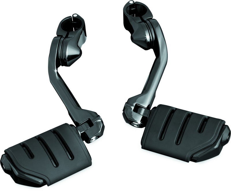 These cruise mounts with positive locking Quick Clamps offer an incredible range of adjustability. The entire assembly may be moved up or down on the engine guard. The arm and footpeg may be further adjusted along a vertical or horizontal arc. A unique clevis permits angle adjustment of the footpeg. The heavy-duty Quick Clamp and sturdy offset arm ensures that the footpegs will clear fairing lowers and will stay where you put them.