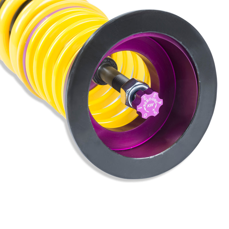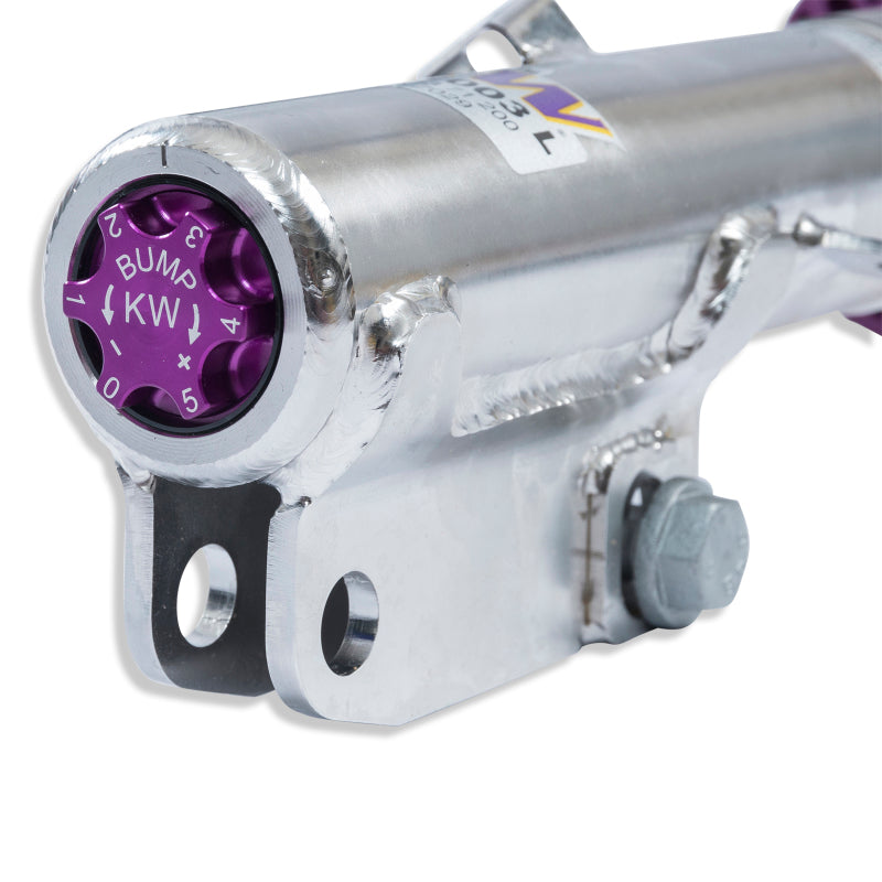 Cutting-edge motorsports technology for more performance on the road. Like every suspension product developed by KW automotive, the suspension manufacturer, and manufactured in Germany, the KW V3 Coilover suspension kit also provides a significant plus in safety reserves in road traffic. Thanks to the chassis with its high-quality dampers, springs, and elastomer spring elements, pitching and rolling movements during load changes such as evasive maneuvers, cornering, acceleration, and braking are significantly reduced. The braking distances are also shortened. Thanks to improved support and feedback, drivers not only feel safer but driving in everyday life becomes even safer. With compression and rebound stage damping, that can be set separately and independently of each other, the damper setup can be customized to your personal driving preferences or vehicle changes such as weight, tire characteristics, or altered vehicle rigidity. True performance optimization is only possible with this unique, patented system. For example, this allows the compression damping force to be increased and get more grip from the tires, to improve cornering behavior and reduce squat without simultaneously altering the rebound stage damping which is optimally matched to the spring rate, a scenario which results in reduced grip and the associated loss of performance. The KW V3 coilover kit is the ideal tool for performance-oriented drivers and experienced tuning enthusiasts who place a strong emphasis on the overall performance of their suspension. The Variant 3 features patented TVR-A and TVC-A technology that provides separately adjustable rebound and compression damping. The extensive adjustment range of the independently configurable rebound and compression make it easy to directly influence the steering behavior, directional stability, grip and handling characteristics for confident and repeatable results at the limit of driving dynamics.