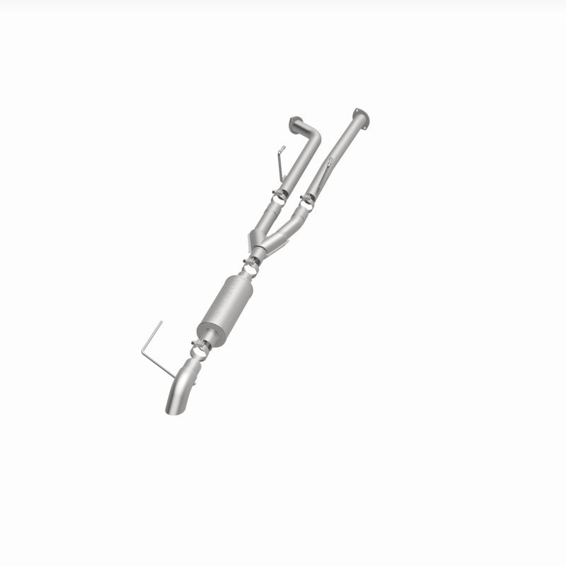 The MagnaFlow 2007-2008 Toyota Tundra Off-Road Pro Series Cat-Back Performance Exhaust System 17112 brings additional off-roading prowess and our deep signature exhaust note to your 5.7L 2007-2008 Toyota Tundra with a weight-optimized, dyno-tested, corrosion resistant and durable stainless steel design engineered to closely hug the undercarriage for improved ground clearance. Exhaust kit 17112 is engineered to produce Very Aggressive exterior and Aggressive interior sound levels. Extensive 3D scanning was used during the development of this Toyota Tundra exhaust system to create a direct-fit design, enabling a do-it-yourself installation process. 17112's emissions-legal cat-back design replaces all your truck's exhaust components from the catalytic converter on back with its 2.5in. diameter mandrel bent main piping that passes through 1 Straight-Through mufflers before ending in a turndown before rear axle exit with 3in. Satin Clamp-On Single Wall Turndown Cut Edge tips. Exhaust system 17112 is produced using advanced CNC precision robotic manufacturing techniques and backed by MagnaFlow's limited lifetime warranty.