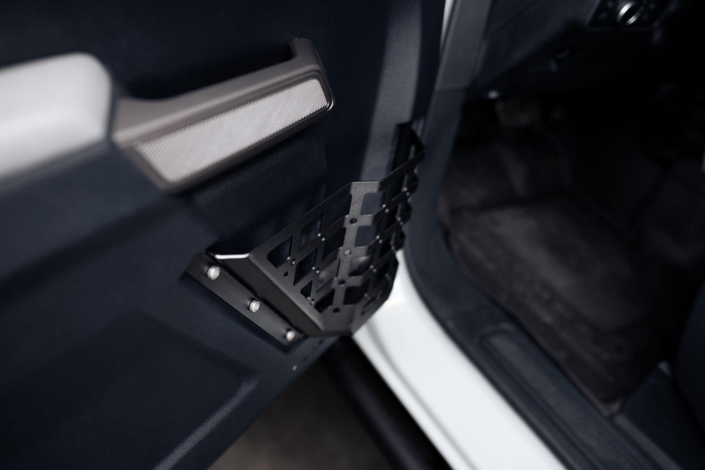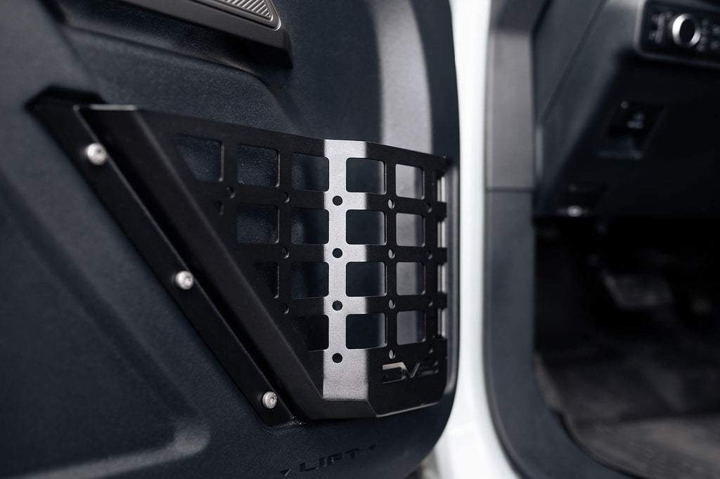 | Description_MKT | Our 2021+ Bronco Front Door Pocket Molle Panels are a direct replacement to the sagging door panel nets. Made from rugged steel, these panels allow you to store items inside the pockets, and molle accessories can be mounted on the outside of the panels. The panels are also designed to hold a water bottle. Installation is quick and easy utilizing factory hardware, and the panels are compatible with all 2- and 4-door 2021+ Bronco models. Increase the utility of your Bronco interior with our front door pocket molle panels. |