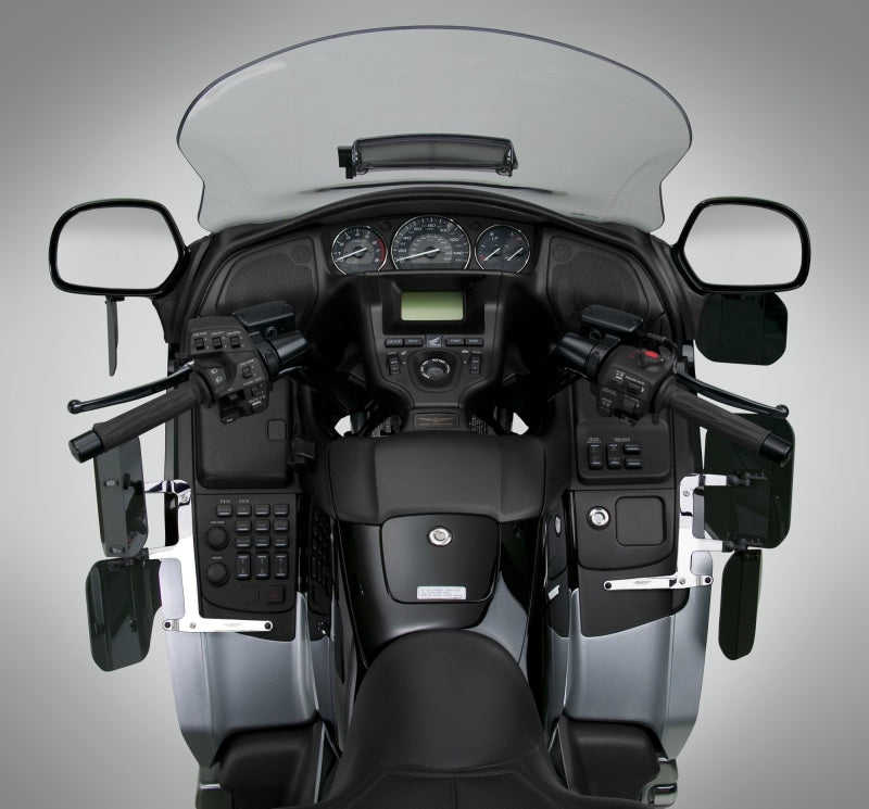 Wing Deflectors allow maximum temperature control of airflow toward or away from the rider. Fully road worthy; once adjusted they stay in place, even at highway speeds. Made from extra-tough hardcoated polycarbonate for outstanding impact strength. Unique Swivel Ratchets allow each Deflector to be incrementally adjusted for personalized temperature control. Strong, one-piece chromed steel brackets will not move out of adjustment.