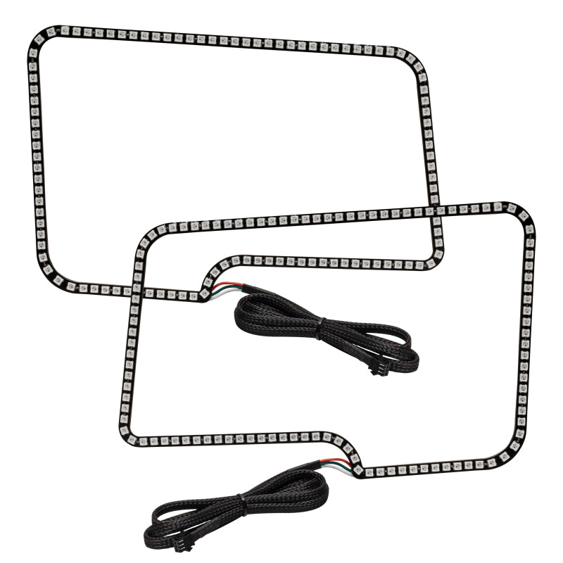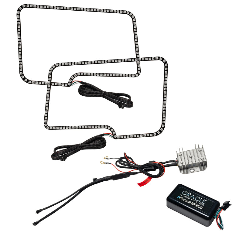 The new ORACLE Lighting Dynamic ColorSHIFT(tm) Halo Kit is the latest advancement in our expansive lighting modifications. The Dynamic features allow the user to run multiple moving color patterns through the Halo ring, creating a vivid eye-catching lighting effect. Conveniently controlled through a free smartphone App, the system features over 200 pre-programmed moving patterns as well as static color control and white mode for normal street driving. In addition to the pre-programmed features the user can also create custom designs through pixel editing in the app. New user-friendly design is a simple plug and play design making wiring easy for even a novice. Connect the ring terminals to the + and - battery terminals then control your lights from the smartphone app. Warranty lifetime period covers the LED and driver components. Hard part decay due to UV damage, oxidation, or environmental conditions are not covered under this stated period.