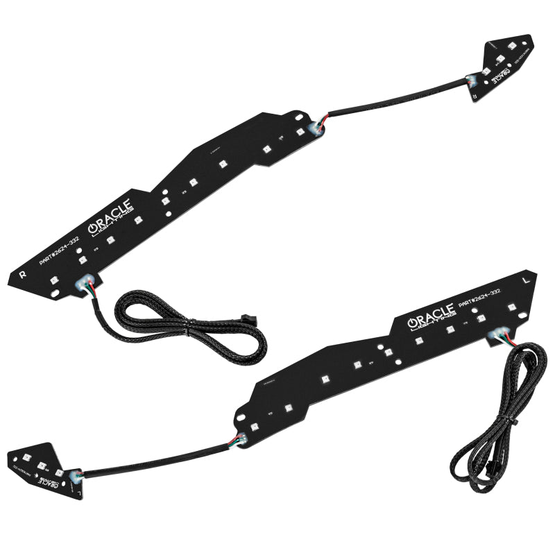 The new ORACLE Lighting Dynamic ColorSHIFT(tm) DRL Replacement + Amber LED Turn Signals for the Chevy Corvette C7 is the latest advancement in our expansive lighting modifications. The Dynamic features allow the user to run multiple moving color patterns through the DRL Replacement Boards, creating a vivid eye-catching lighting effect. Conveniently controlled through a free smartphone App, the system features over 200 pre-programmed moving patterns as well as static color control and white mode for normal street driving. There's also fully integrated Amber LED Turn signals that can be wired directly into your factory turn signals. In addition to the pre-programmed features the user can also create custom designs through pixel editing in the app.