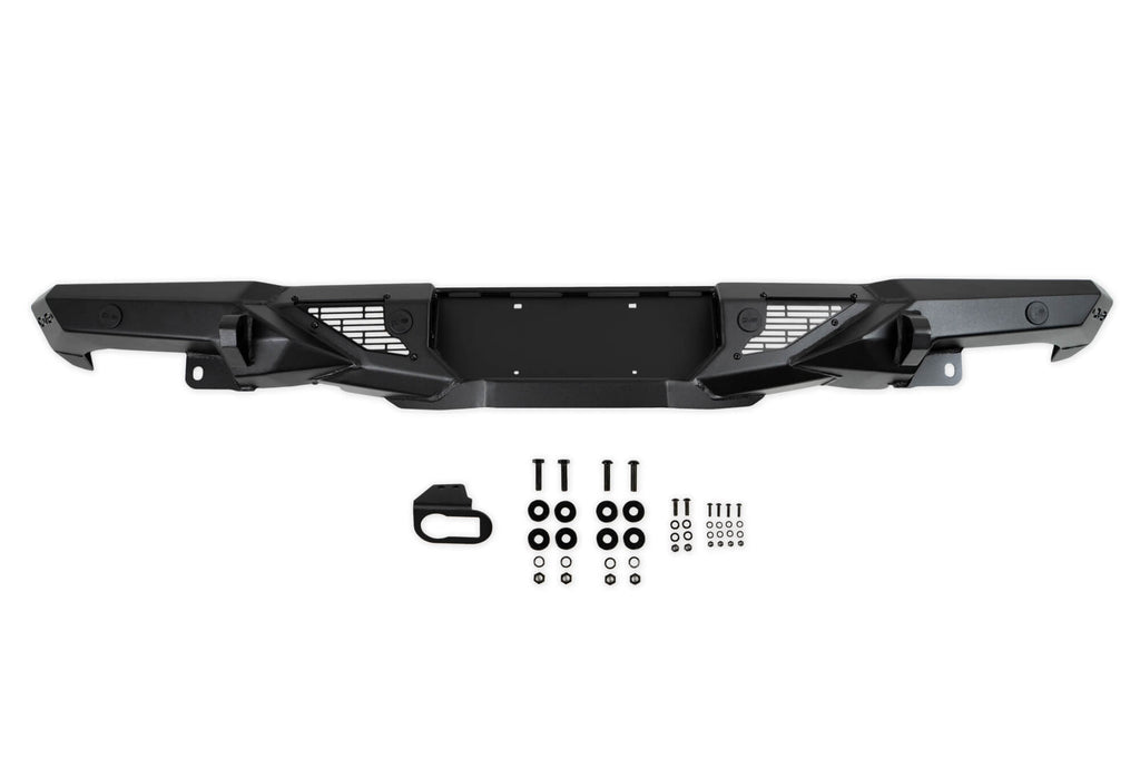 | Description_MKT | The Spec Series Rear Bumper for the Jeep Gladiator features a high clearance design for aggressive rock crawling. It is capable of mounting two 3-inch light pods towards either end of the bumper for supplemental trail lighting. There are welded zip-tie tabs on the interior of the bumper to provide clean wire management options. Two clevis mounts capable of running ?-inch D-ring shackles provide recovery options if needed. The bumper was finished in a rust-resistant micro texture black powder coat, with satin black aluminum accent panels. The Spec Series is compatible with the factory hitch and also includes a high clearance trailer wiring mount. |
