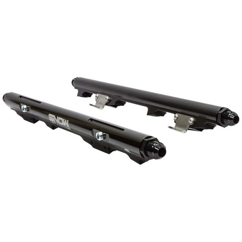 If you're looking for cheap fuel rails with crappy mounting brackets that allow fuel leaks, this product is not for you! If you're looking for the best fuel rails on the market, you have come to the right place. Snow Performance Fuel Rails are designed and built in the USA from the highest quality components available. Snow fuel rails are CNC machined for a perfect fit and are anodized in black for the ultimate in looks and corrosion resistance. These fuel rails are supplied with brackets to accommodate factory height injectors. Optional fuel rail brackets and/or injector spacers are available separately to adapt all of the popular LS length injectors to all of the popular LS and truck intake manifolds. Our fuel rail brackets are made from high-strength stainless steel to ensure the rails stay in place and do not leak in high-pressure conditions. Snow rails are ready to flow as much fuel as your engine needs, made for use with 8AN ORB fittings in the inlets/outlets of the rails there is no need to worry about fuel leaks or flow restrictions. These rails also incorporate two 1/8-NPT ports in each rail for gauges, sensors, or fuel fittings to feed your nitrous system with no additional fittings required. Kit includes: Two Billet Fuel Rails, Four 1/8-NPT Plugs, Four 8AN Inlet/Outlet Fittings, Stainless Steel Mounting Brackets for stock height injectors. Non-stock height injectors can be used in conjunction with Snow Performance adapter fuel rail brackets and/or injector spacers (available separately).