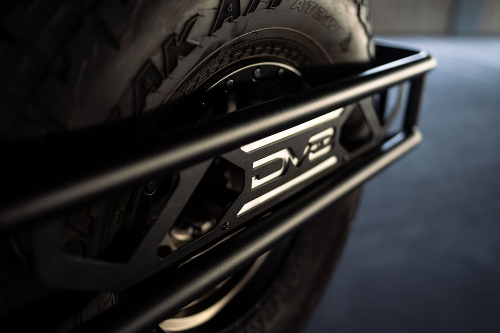 | Description_MKT | The Bronco Spare Tire Guard was designed with several functions in mind. After upgrading to larger tires, the spare tire has been known to cause flex in the tailgate due to the added weight on the factory carrier. The tire guard reinforces the tailgate by mounting to multiple points along the tailgate, increasing rigidity. It also provides a mounting location for gear such as hi-lift jacks, a shovel, tanks, and more. Additionally, the guard can accept locking pins (not included) for security against theft. |
