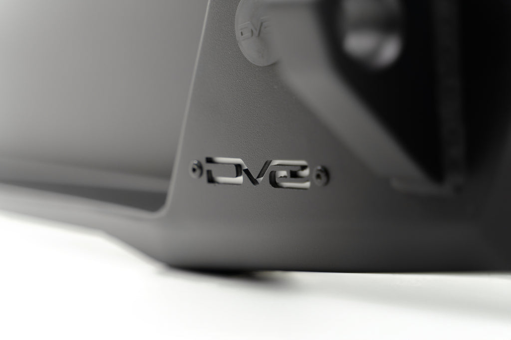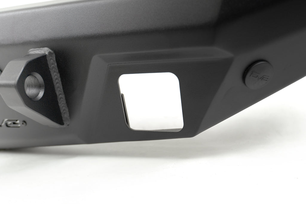Our FS-7 Series Rear Bumper features a sleek, mid-width design. The FS-7 can fit up to a 37-inch spare tire above the bumper using the factory carrier. The bumper includes a license plate bracket with a license plate light to relocate the plate over to the side away from your spare tire. A pair of 1-inch thick reinforced mounts for D-ring shackles provide recovery options. Rear lighting options include (2) 3-inch pod light mounts that sit in a shielded position behind perforated aluminum accent panels. Welded zip tie tabs provide clean wire management.