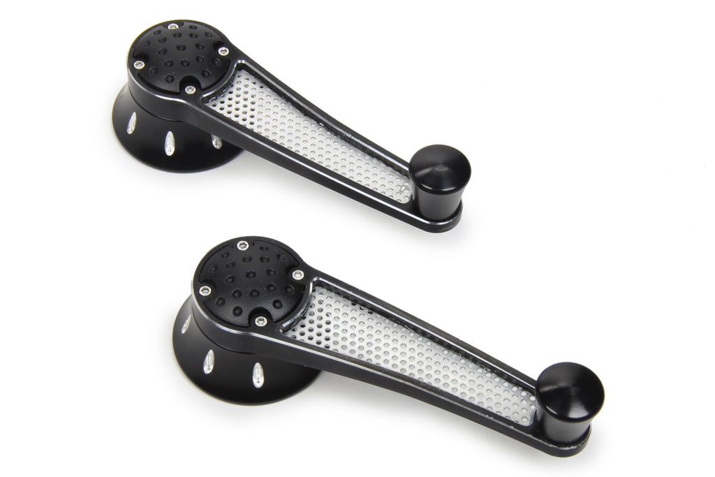 Window Crank - Drilled Mesh Style - Mesh Inserts - Aluminum - Black Anodized / Machined - Ford / GM - Pair